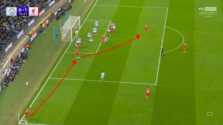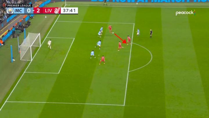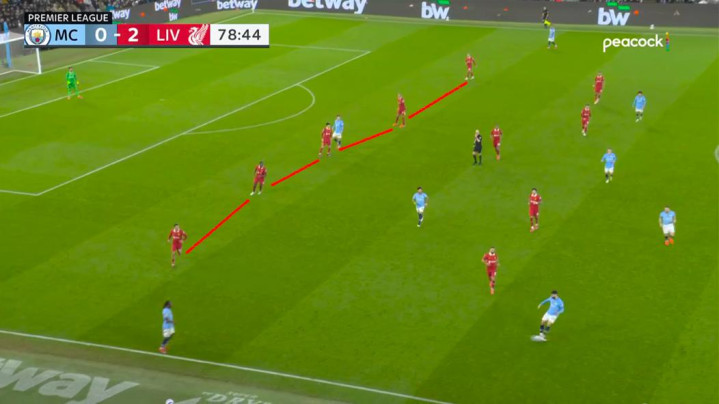 在第56分钟,看起来利物浦已经锁定了这场比赛的胜局——琼斯打进了第三个进球。但由于索博斯洛伊的轻微越位,这个进球被判无效。此后,曼城迎来了比赛中表现最好的阶段。在下半场中段,主队不断对利物浦的禁区施加压力。斯洛特(曼城教练)用更具防守属性的远藤航换下了琼斯。这位日本球员经常回撤到防线,成为第五名后卫。